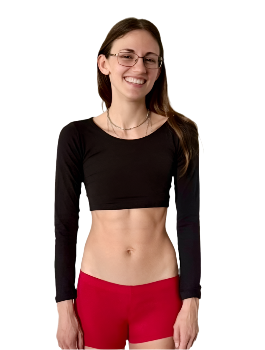 This long sleeve form-fitting black crop top is made from a stretchy cotton spandex fabric. The sleeves are longer than they appear in the pictures.
